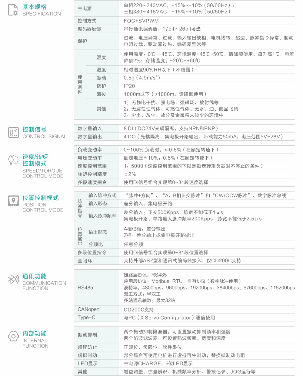 CD200系列脈沖型伺服驅(qū)動(dòng)器是四方電氣研制的一款通用型高性能交流伺服驅(qū)動(dòng)器,支持Modbus、CANopen通訊協(xié)議,采用對(duì)應(yīng)的通訊接口,配合上位機(jī)可實(shí)現(xiàn)多臺(tái)伺服聯(lián)網(wǎng)運(yùn)行。該系列搭載了最新的單參數(shù)自整定、1秒慣量測定功能、在線負(fù)載測定、在線共振抑制、末端振動(dòng)抑制、多軸控制環(huán)同步等功能,使得伺服控制便捷易用。配合 CM10 系列高響應(yīng)伺服電機(jī),運(yùn)行可靠平穩(wěn),適用于包裝、食品生產(chǎn)、數(shù)控切割、紡織、機(jī)床、木工雕刻等典型行業(yè)的自動(dòng)化設(shè)備,以高性能方案實(shí)現(xiàn)快速且精準(zhǔn)的位置控制,速度控制與轉(zhuǎn)矩控制。